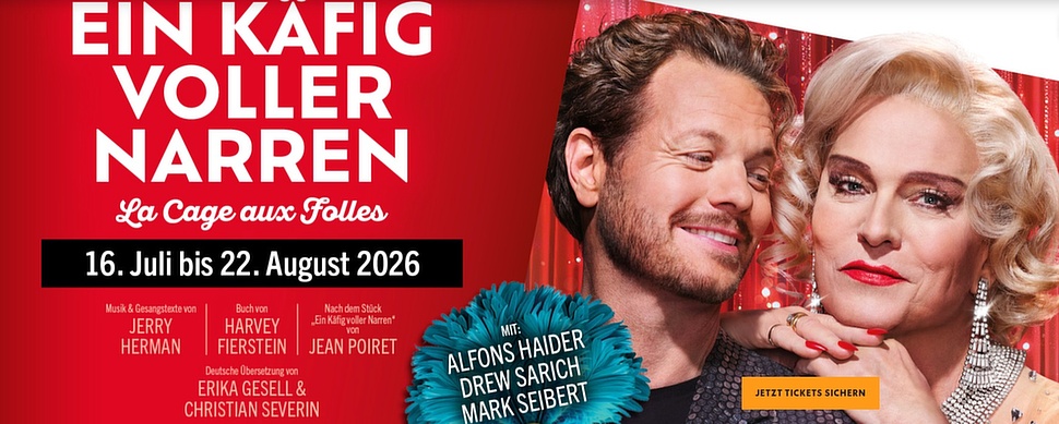 Im Sommer 2026 kommt die weltberühmte Erfolgskomödie aus den 70ern als Musical auf die Seebühne Mörbisch. Das einzigartige Theaterstück aus der Feder von Jean Poiret verwandelten Jerry Herman und Harvey Fierstein in einen Klassiker des Musical-Genres. Seit den 80ern erobert das turbulent-mitreißende Plädoyer für Toleranz, Gleichberechtigung und individuelle Freiheit im Musicalgewand die Bühnen der Welt, getreu dem Motto: "Ich bin was ich bin!"
