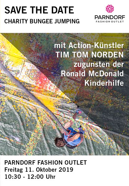 Ein Charity Event der besonderen Art: Der österreichische Performance-Künstler Tim Tom Norden lädt bereits zum dritten Mal Promis und VIPs in das Parndorf Fashion Outlet zum sogenannten Sky-Painting: Einer einzigartigen Kombination aus Popart und Actionpainting, die Bungee Springen und Kunst verbindet. Beim Bungee Sprung von einem 65 Meter hohen Kran wird der künstlerischen Ader freien Lauf gelassen. Denn alle Mutigen, die den Sprung wagen, werden mit Farbflaschen ausgestattet. Dabei werden im freien Fall die am Boden liegenden Leinwände, mit von Tim Tom Norden geschaffenen schwarzweiß Silhouetten in einer Dreier-Serie, im Jackson Pollock Stil bespritzt. Dadurch entstehen einzigartige Pop-Art-Trilogien. Themen der Bilder sind bekannte Gemälde, Persönlichkeiten und Gegenstände. Die Unikate werden im März 2020 bei einer großen Benefiz-Kunst-Auktion für den guten Zweck versteigert. Der Erlös wird diesmal der Ronald McDonald Kinderhilfe zu Gute kommen. Im Vorjahr konnten im Zuge der Charity-Auktion rund 120.000 Euro gespendet werden.