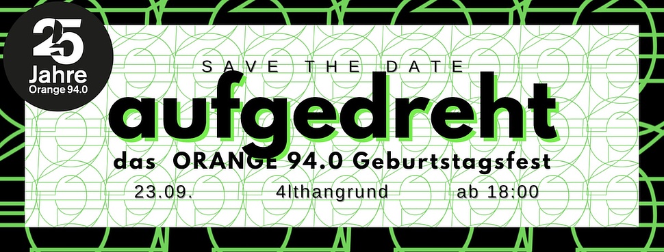 ORANGE 94.0, das Freie Radio in Wien feiert Geburtstag – 25 Jahre Sendefrequenz, 25 Jahre Community Radio in Wien! Das Vierteljahrhundert begehen wir aus tiefster Überzeugung: feministisch, solidarisch und mit guter Kulinarik. Für Unterhaltung sorgen Konzerte, Performance, Comedy und Karaoke, dazu geben die o94 DJs ihre Tunes zum Besten – mit tanz- bis stampfbaren Sounds, schwingenden Gesängen und eklektischen Beats bis spät in die Nacht. Raus aus der Bubble, rein in die Orange!